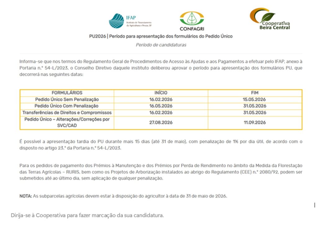 A Cooperativa Beira Central informa todos os seus associados e agricultores da região que já se encontra definido o período de apresentação dos formulários do Pedido Único (PU) 2026, conforme[…]