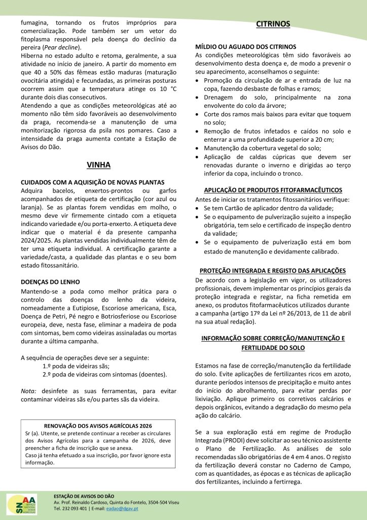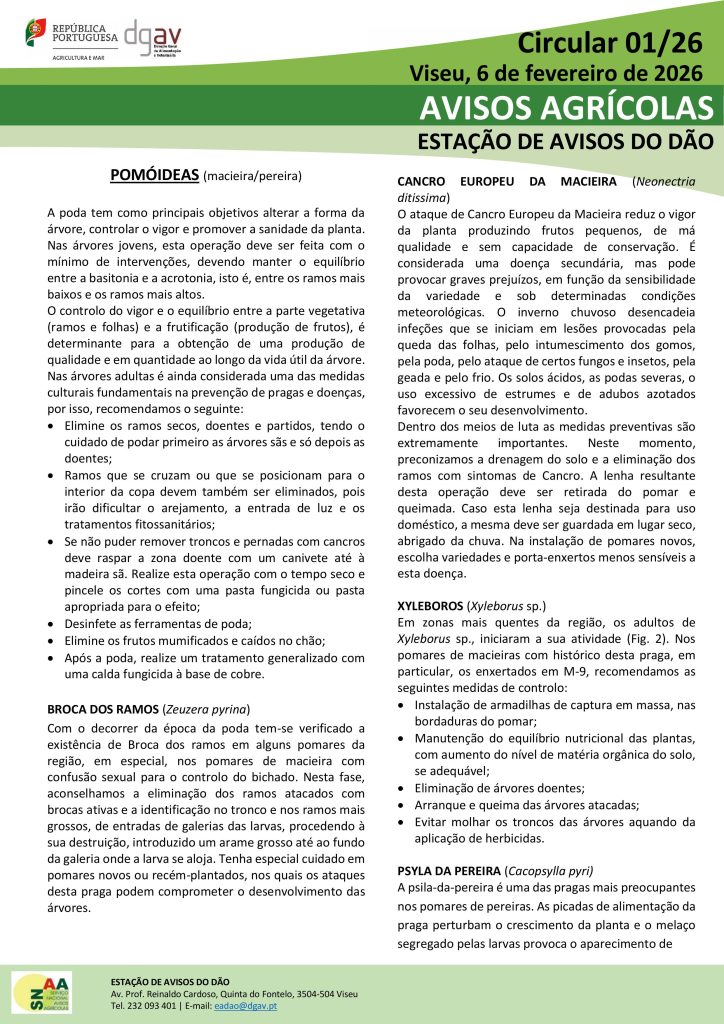 A Cooperativa Beira Central partilha a Circular 01/26 da Estação de Avisos do Dão, com orientações essenciais para a campanha agrícola de 2026.